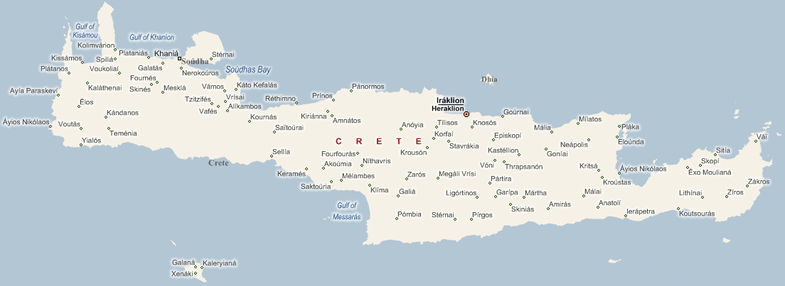 Adele - Adelianos Kambos Agia Fotia Agia Marina Agia Pelagia Agia Triada Agios Myronas Agios Nikolaos Akrotiri Ammoudi Amoudara Amoudara Analypsis Anissaras Arhanes Arolithos Axos Bali Chania City Chersonissos Chromonastiri Daratso Elefterna - Margarites Elounda Estavromenos Fodele Fragokastelo Georgioupolis Gournes Gouves Heraklion Heraklion City Hiona Ierapetra Kalamaki Kalo Horio - Istron Kalonyktis Katalagary Kissamos Kokkini Hani Kolymbari Ligaria Machairoi Village(Apokoronas) Maleme Malia Matala Megala Chorafia Milatos Missiria Palekastro Paleochora Panormo Perivolia Piskopiano Plaka Plakias Platanias Platanias Prines Provarma Rethymno Town Samonas Scaleta Sfakaki Sissi Sitia Skines Village Stalis Stalos Vamos Vlychada - Bali